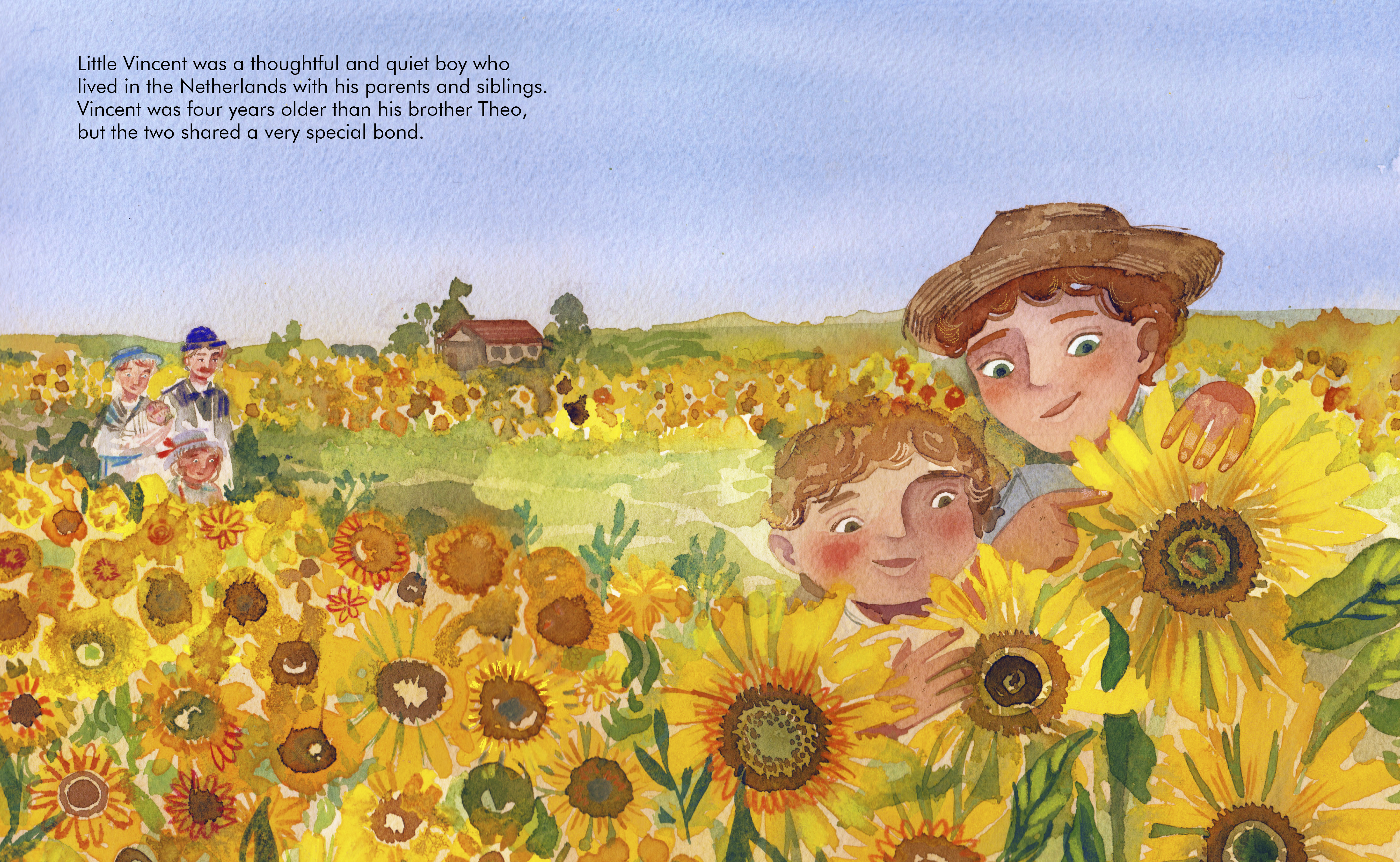 Little Vincent was a quiet child. He loved spending time in nature and playing with his brother Theo. After leaving school, he began working as an art dealer. Vincent showed promise, but he found it more and more difficult to control his emotions and eventually had to leave. He had a go at many different jobs, including a teacher and a bookseller, but nothing felt right.